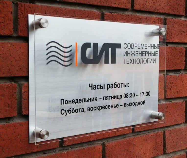 Заказ был выполнен с использованием современного оборудования: металлическая подложка изготавливалась и обрабатывалась на лазерном или фрезерном станке, закалённое стекло раскраивалось и сверлилось на специализированном оборудовании для стекла, печать логотипа и текста производилась на плоском УФ-принтере, а финальная шлифовка и полировка элементов придали конструкции аккуратный и презентабельный вид; монтаж осуществлялся с помощью профессионального инструмента на декоративные дистанционные держатели из нержавеющей стали.