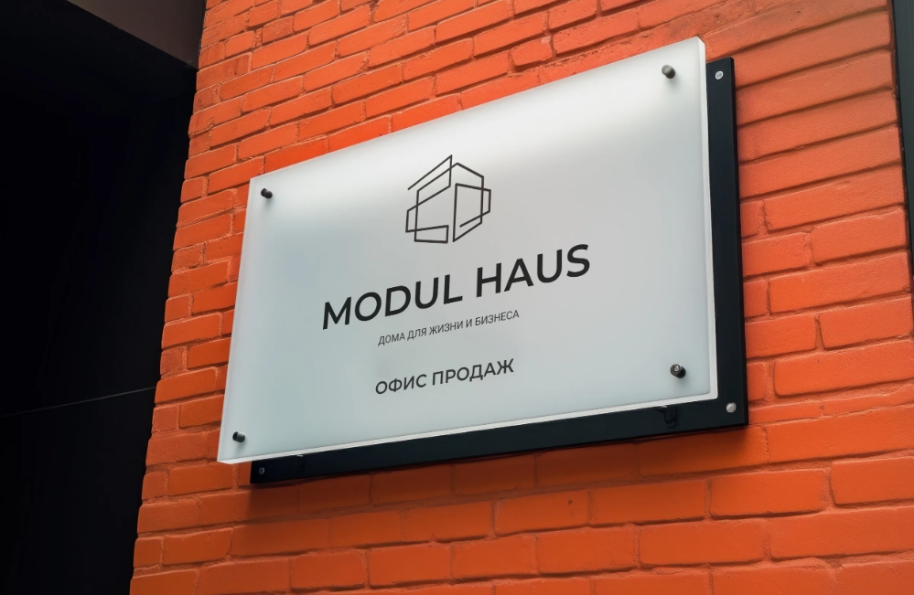 Заказчик — компания «Modul Haus» — обратилась к нам для изготовления фасадной таблички для оформления офиса продаж.