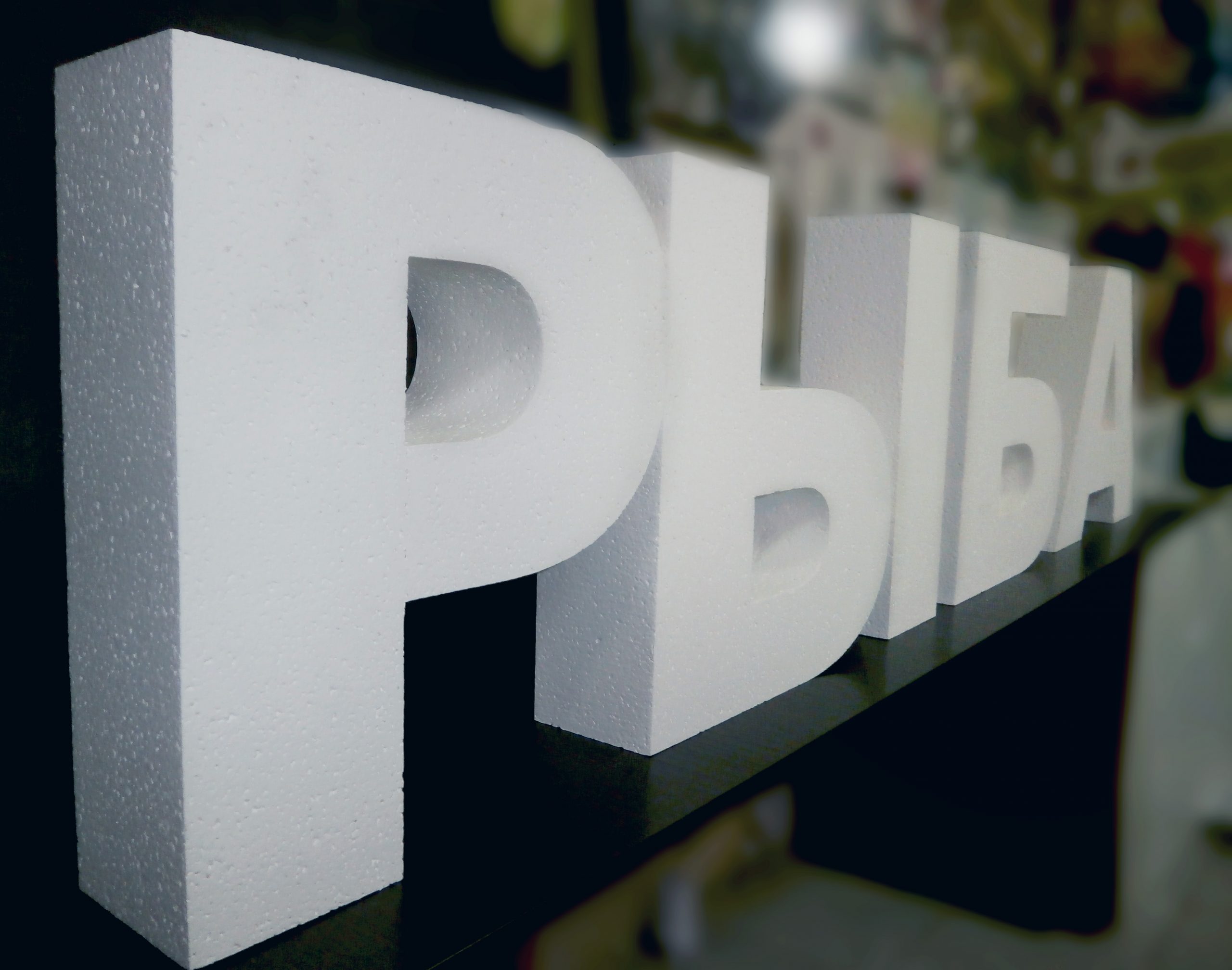 Заказчик — рыбный магазин — обратились к нам для создания объемных букв из пенопласта, которые бы информировали покупателей. Основные требования при выполнении заказа: