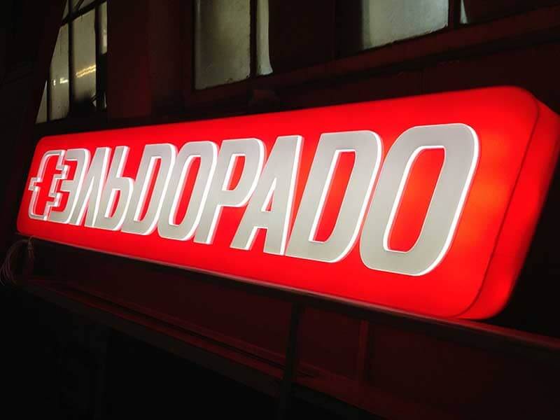 Прямоугольный короб с баннерной тканью с подсветкой. Для него была сделана каркасная металлическая рама, а на нее — натянут светорассеивающий баннер. Торцы были закрыты пластиковым профилем.