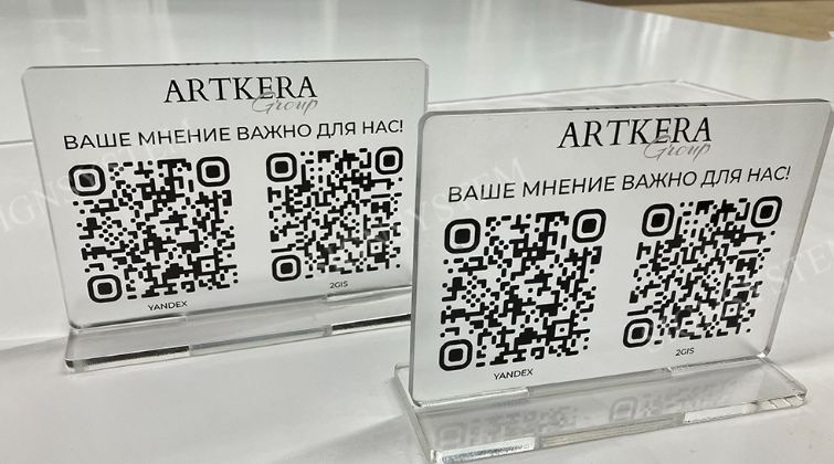 Для проекта была изготовлена большая прямоугольная табличка из прозрачного акрила размером 1200×500 мм. На поверхность методом прямой УФ-печати нанесено оформление с использованием цветного шрифта (синий, красный, голубой), логотипа и тематических иконок. Такая технология позволила добиться высокой чёткости изображения, яркости цветов и долговечности вывески.