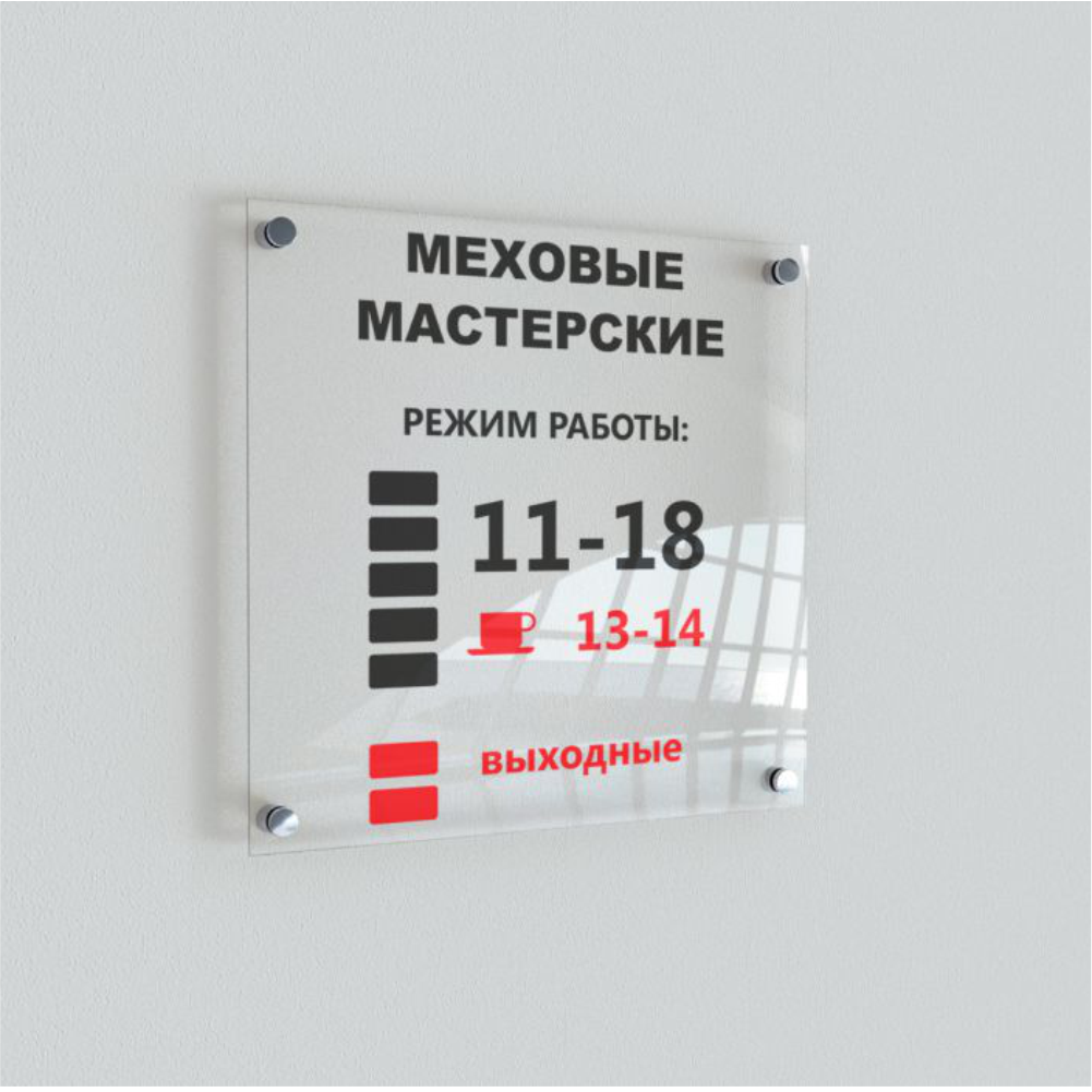 Заказчик — меховая мастерская — обратился к нам для изготовления акриловой таблички с режимом работы для размещения на фасаде здания.